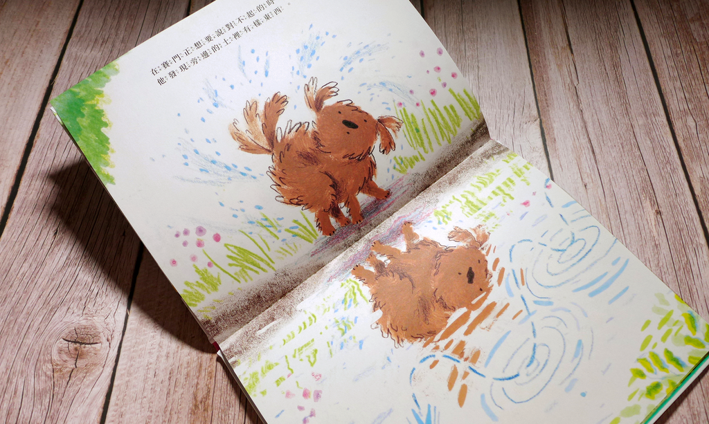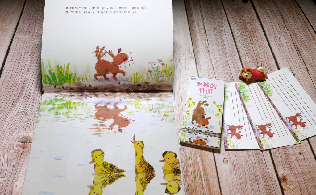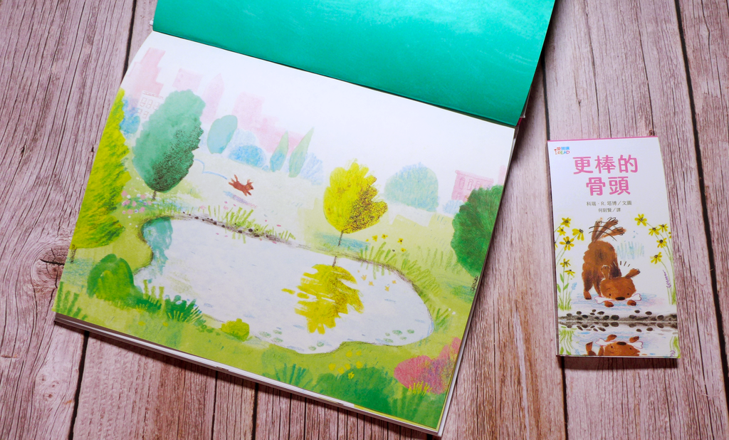 繪本《更棒的骨頭》改編自〈貪心的狗〉,由榮獲美國凱迪克大獎與多項童書大獎的插畫家科瑞.R. 塔博繪製。以輕鬆正向氛圍,取代籠統教育思維,給予成人及兒童讀者更愉快的閱讀感受。首頁以明亮柔和之漸層色調開展視野,映入眼中的澄澈池塘風景彷彿身歷其境,畫面由遠至近,集中在毛茸茸的小狗狗賽門身上,狗狗掘土、搖尾巴、轉圈圈等嬉戲動作,為靜態插畫增添活潑動感,在第一時間拉近了讀者與角色間心的距離。