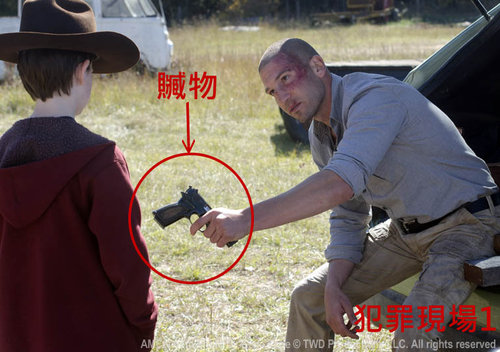 Carl看到雙手沾滿鮮血的Rick,馬上舉起(Daryl的)手槍瞄準目標。這段我倒回去看了三遍,想確定Carl是想殺Rick、誤擊Shane,或原本就對準屍化的Shane。假若是前者,只能大嘆家門不幸,出了此等孽子;假若是後者,月黑風高的,站在遠處的Carl如何確定Shane是人是鬼?說來Shane待Carl不薄,但他開槍倒是毫不猶豫,這告訴大家千萬別幫人養小孩,養老鼠咬布袋啊